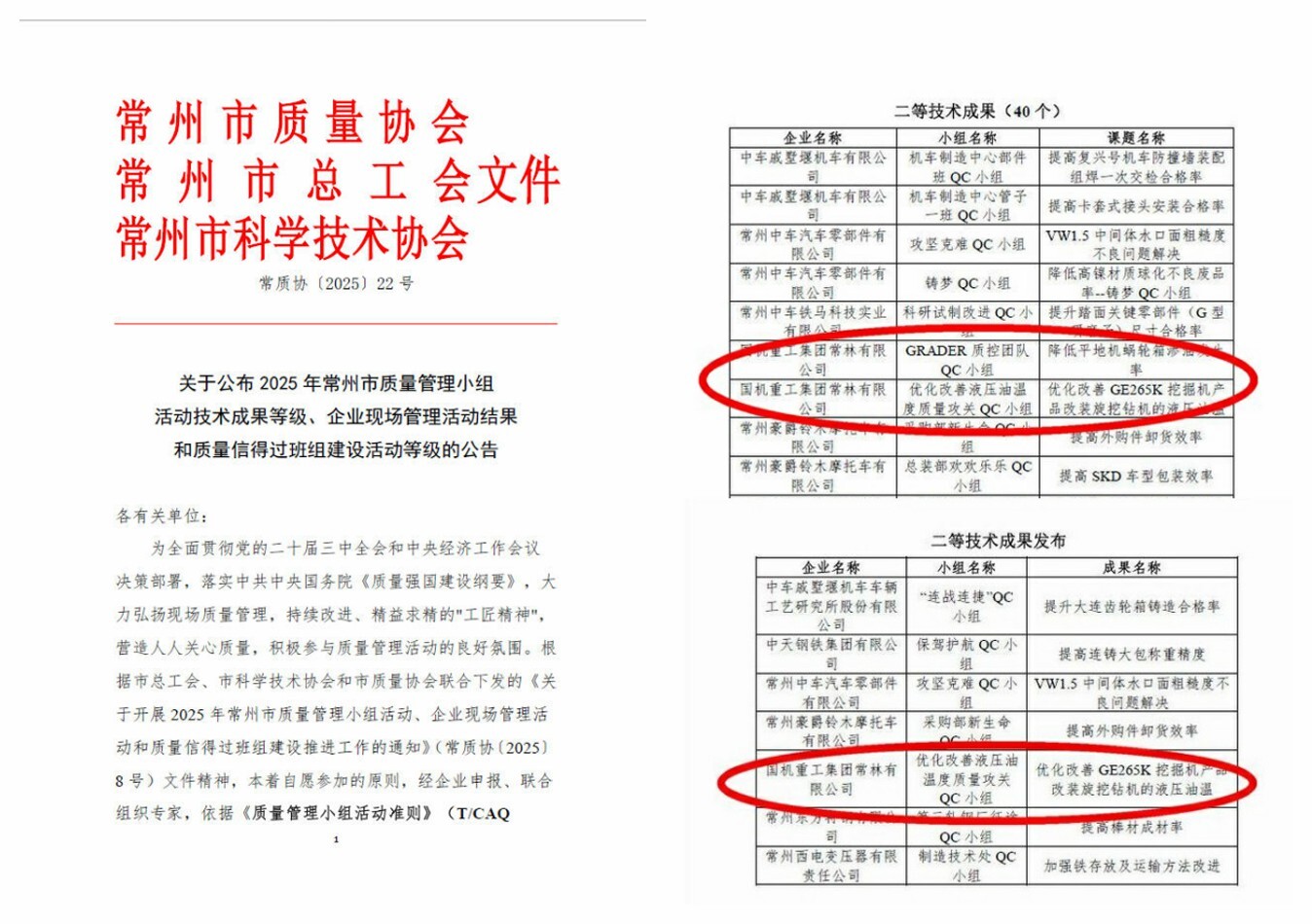 近日,常州市質量協會正式公布2025年常州市質量管理小組活動評選結果,常林公司申報的“降低平地機蝸輪箱滲油發生率”“優化改善GE265K挖掘機產品改裝旋挖鉆機的液壓油溫”兩個QC項目從82個參選項目中脫穎而出,分別榮獲常州市質量管理小組活動技術成果二等獎與QC小組活動技術成果發布二等獎。
